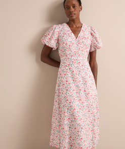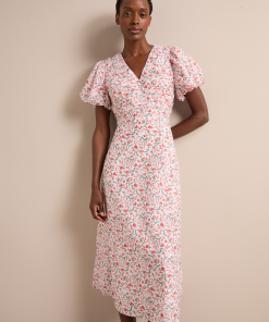 Designed in a luxe, naturally breathable cotton silk voile, the Elisa dress is ideal for smarter summer lunches and warm weather events. Featuring a pretty trailing feather print, the bubble-hem sleeve and ruched bodice give it modern femininity. Style with a strappy heel for effortless elegance.