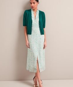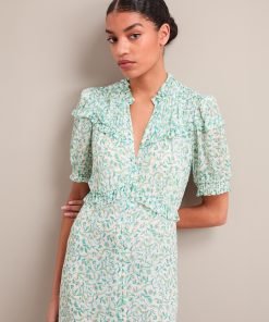 Taking inspiration from the romantic femininity of the 1930s, Viola is made for summer weddings, christenings, garden parties and more. Cut from soft georgette with metallic gold fil coupé which gives eye-catching sparkle, it has a flattering V-neckline, pretty frill detailing, and delicate rouleau buttons. Easy wearability comes by way of its shirred back waist and midi length, and it’s fully lined to guarantee opacity.